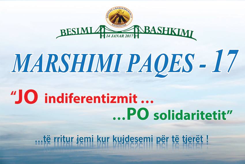 Pikërisht në vigjilje të Vitit të Ri, në Elbasan, përfaqësues të të gjitha feve, së bashku me Kryqin e Kuq Shqiptar nënëshkruan një marrëveshje nën sloganin “Jo, Indiferentizmit … Po, Solidaritetit!” për të mbledhur fonde për fëmijët në nevojë në Siri. Sot, në kuadër të kësaj marrëveshje u organizua Marshimi i “Paqes 2017- “Jo, Indiferentizmit … Po, Solidaritetit!” ku krahas përfaqësues të feve të ndryshme dhe të Kryqit të Kuq, morën pjesë dhe përfaqësues të instititucioneve shtetërore dhe akademike, por dhe deputetet, të Elbasanit. Marshimin e hapi Don Emilio Valente dhe u përshëndet nga Kryetari i Bashkisë. Z. Qazim Sejdini, marshuesit u përshëndetën nga deputetet Evis Kushi e Arbjola Halimi, por dhe nga deputetet Luciano Boci e Taulant Balla dhe dhe prefekti i Qarkut, përfaqësues nga komuniteti muslyman, Rektori i Universitetit “Aleksandër Xhuvani” Drejtoresha e DAR, Elbasan, përfaqësues të komunitetit ortodoks, bektashian, Kryetari i Këshillit të Qarkut dhe Vëllazëria Ungjillore, dhe Presidenti i Kryqit të Kuq Shqiptar z. Ylli Alushi. Një marshim i tillë në mbështetje të fëmijëve dhe të gjithë atyre që vuajnë në Siri, është një shembull i mrekullueshëm sesi i gjithë komuniteti në Shqipëri di të bëhet bashkë, në në ndihmë të atyre që vuajnë.